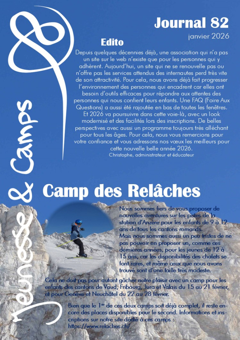 1er journal de Jeunesse et Camps: convocation à l'Assemblée Générale, le camp de ski et de snowboard à Saas Grund et l'annonce des camps d'été